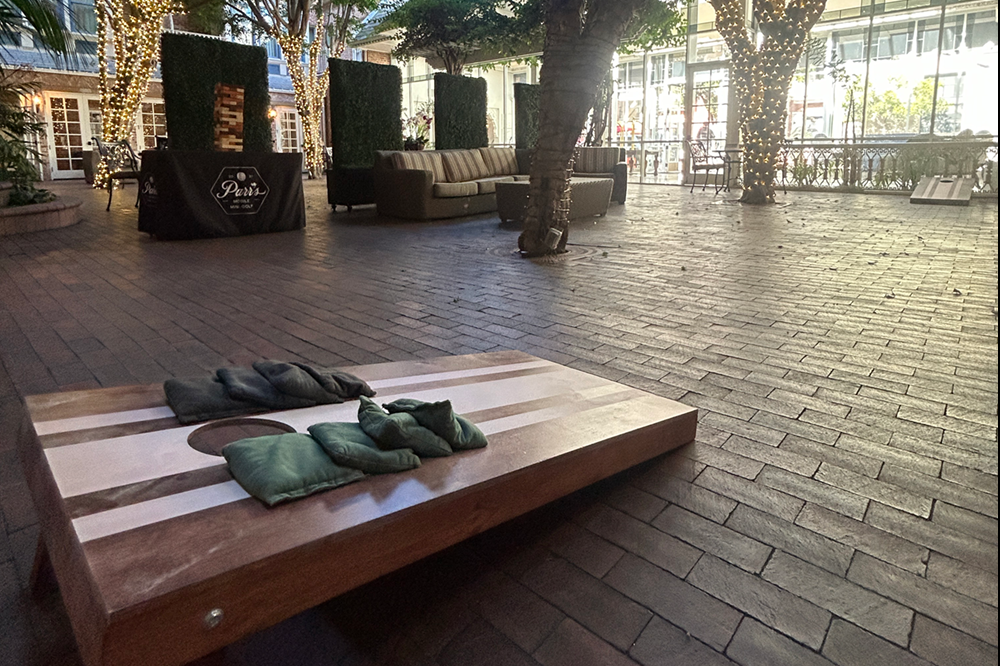 Add a beautifully stained corn hole set to complement your mini golf rental. Each set comes with 2 boards, 4 forest green bags, and 4 black bags. Book alone or 20% off with mini golf course rental. 2 sets available. Standard rental lasts up to 4 hours (additional hours $25/hr).